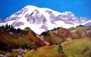 I’ve been creating my own Christmas cards since 2000, each December choosing a different piece of my artwork for the cover image. Two years ago it was a painting of a Venice balcony (painted from the photo you see a portion of above), last year an abstract derived from a glass sculpture, and this year a view of Mt. Rainier (left). Then I print a newsy message on the inside. That’s what I’ve been working on for the past couple of days.Composing the letter is more than a writing exercise. It’s an invitation to take stock of things, to review the events of the year just concluding, and look forward to what is to come. Any applicable major life events – marriages, deaths, births, graduations, changes of job or residence – figure prominently. But I try to add a few personal details for flavor, and a photo or two. Then I usually close with a reminder of what Christmas means to us (the reason for the season).