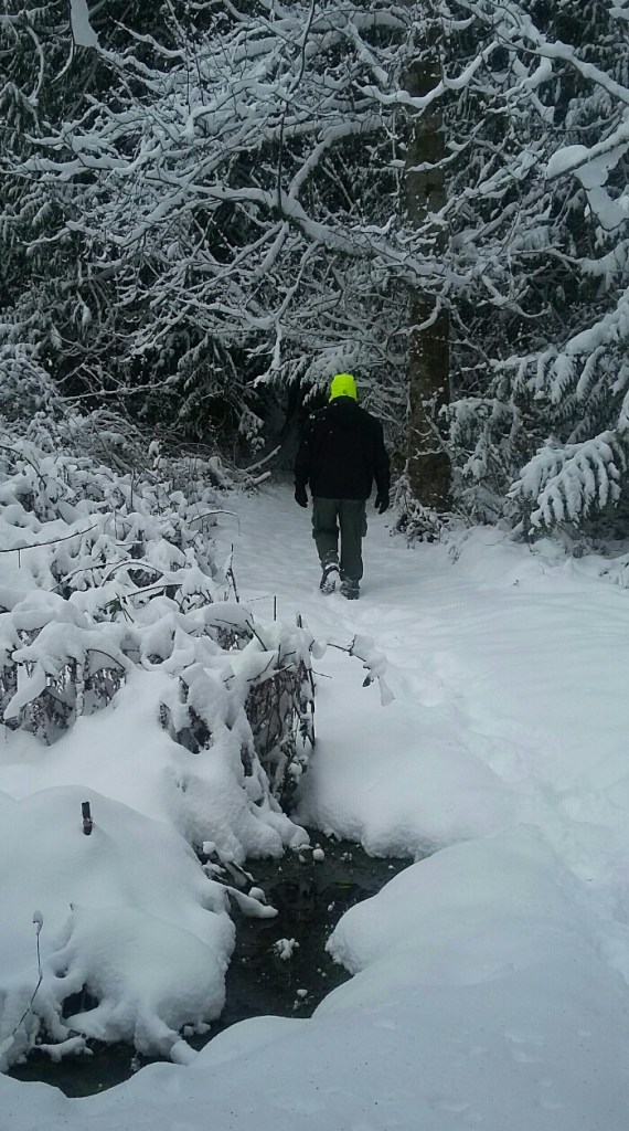 I’m pretty dedicated to my morning walks – about 2 1/2 miles with significant elevation gain, over the roads and trails of our rural neighborhood. It’s something I started on my own years ago, after I quit my “day job,” and which I now continue with my husband since he retired. We go rain or shine, or even in 8-10″ of snow like this morning! I draw the line at high winds, though, since we’re surrounded by large trees that have a way of blowing over from time to time.