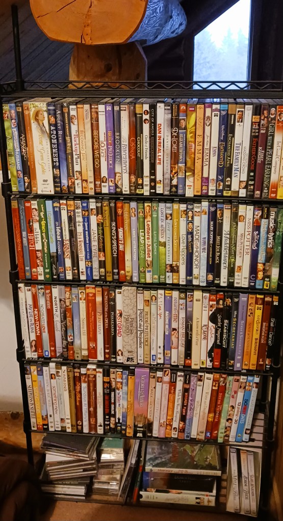 Movie selection is critical, of course. Unless I have a DVD borrowed from the library for us to watch, we normally pick something from my personal collection (which is separate and distinct from my husband’s collection, btw). The question is, what are we in the mood for? Rom-com (i.e. While You Were Sleeping, You’ve Got Mail). Period drama (Jane Austen Adaptations top the list, naturally). Something quirky and fun (like Strictly Ballroom). A musical we can sing along with (The Sound of Music, Mama Mia). It doesn’t matter that we’ve seen some of them a dozen+ times before.