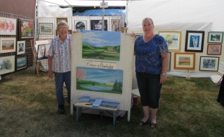 On the weekend of August 3-5, I participated in an outdoor art show in the nearby community of Eatonville, WA. After feeling smug and comfortable during the mild start to our Seattle summer, we finally caught up with the rest of the country that weekend, which meant I spent 3 days roasting out in the heat. Still, it was an opportunity to hang out with my mom (pictured) and to talk art and books with friends and visitors, something I will endure considerable inconvenience to do! (photo courtesy of John Pelkey)